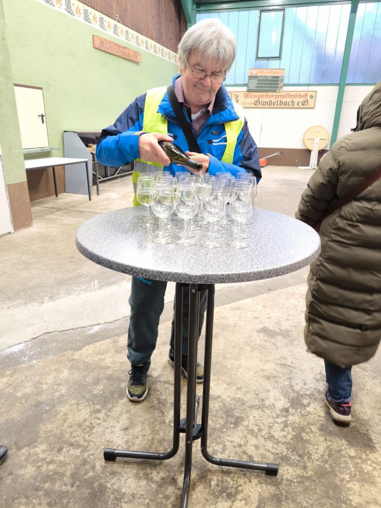 Im Hof der Pension wurde vom Leiter der Ortführung die Gruppe mit ca. 60 Personen begrüßt. Nach Ausführungen über die Entstehung des Ortes und die früheren Namen ging die Wanderung mit den Erläuterungen des früheren „Wirtschaftszentrum“ Adler, Krone, Lamm weiter, ehe man die frühere Krankenpflegestation von außen besichtigte. Danach wurde erklärt wie die frühere Kraftwagenhalle zur Dampfwaschküche mit Badeanstalt umgebaut wurde. Nach kurzem Weg kam man zur einzigen Einkaufsmöglichkeit in Gündelbach zum Hof Schillinger in dem auch früher der Gemeinde-Hommel/Bulle untergebracht war. Von diesem Ort konnte man zur Mühle blicken die wahrscheinlich als erstes Haus in Gündelbach stand und das erste Mal 1527 erwähnt wurde. Weiter ging es zur ehemaligen Halle der Post-Omnibusse, von dort konnte man zum früheren Steinbruch blicken. Nach kurzer Gehzeit erreichte am die Waagstraße dort gab es einiges zu erklären, mit der früheren großen Waage, dem Backhaus, Pfarrhaus und Gemeindehaus. Über die Außenbesichtigung des ehemaligen Gebäudes der Spar- und Darlehenskasse erreichte man die ehemalige Dreschhalle mit Blick auf die Weinberge. Eine Beschreibung erfolgte über den Hamberger See und den Steinbachhof, ehe man zur Kelter kam in der es eine kleine Weinprobe gab. Hier wurde erklärt wie die Kelter erbaut wurde und welchen Zweck sie hatte ehe man noch über die Entstehung der alten Schule sprach sowie die Erbauung der Kirche, des Rathauses und daneben stehenden Wohnhäuser. Nun war es nicht mehr weit um kurz nach 17.00 Uhr im Kachelofen ein „Besenplatten-Buffet“ zu sich zu nehmen um gemütlich den Abschluss zu finden.